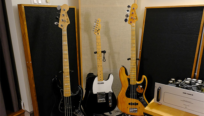 1977 and 1978 Fender Jazz basses and a late 80's Tele.